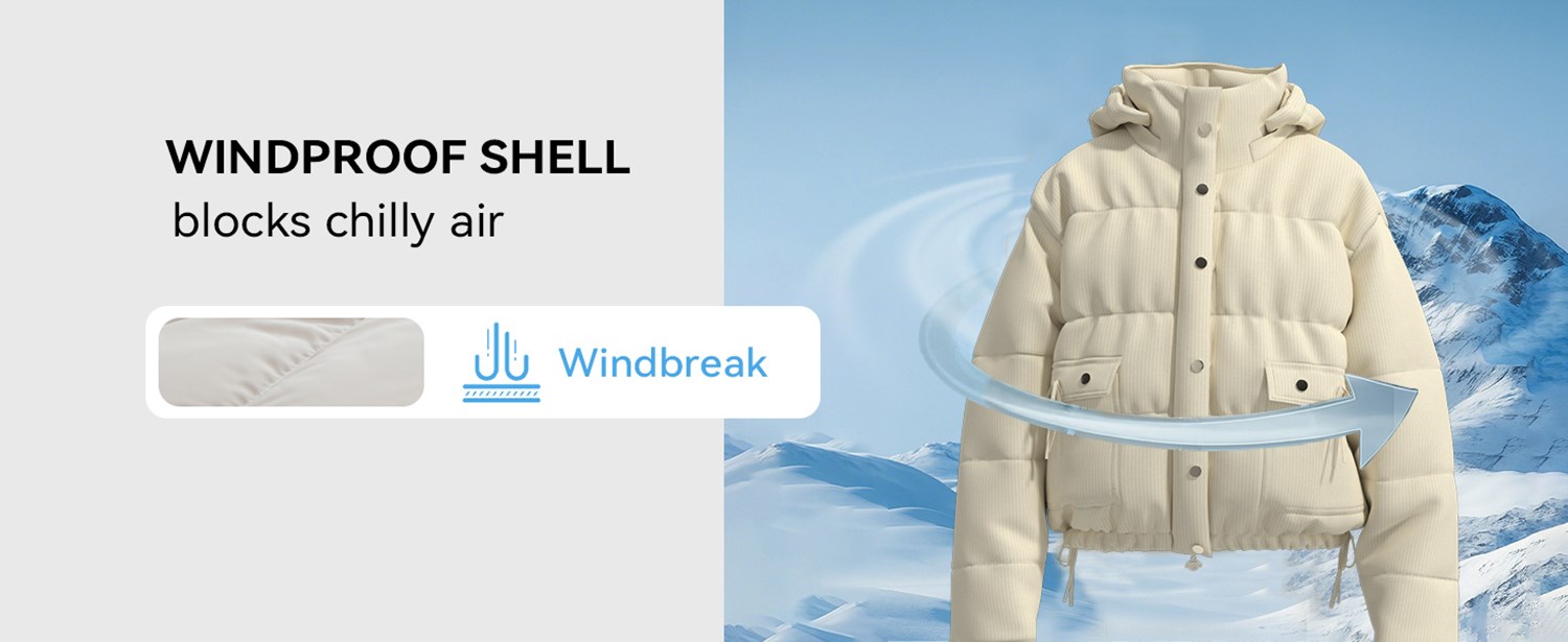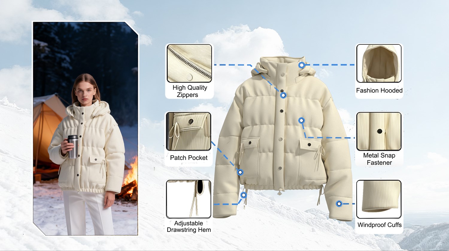 ①Hooded Design:The hooded design effectively blocks wind drafts while providing additional thermal protection for the head, enhancing overall warmth to keep the wearer comfortably insulated in cold conditions.