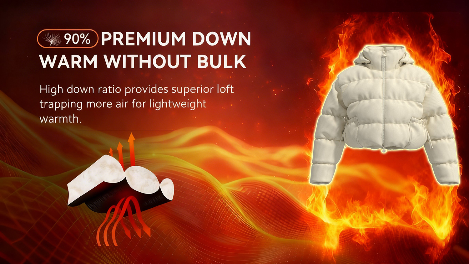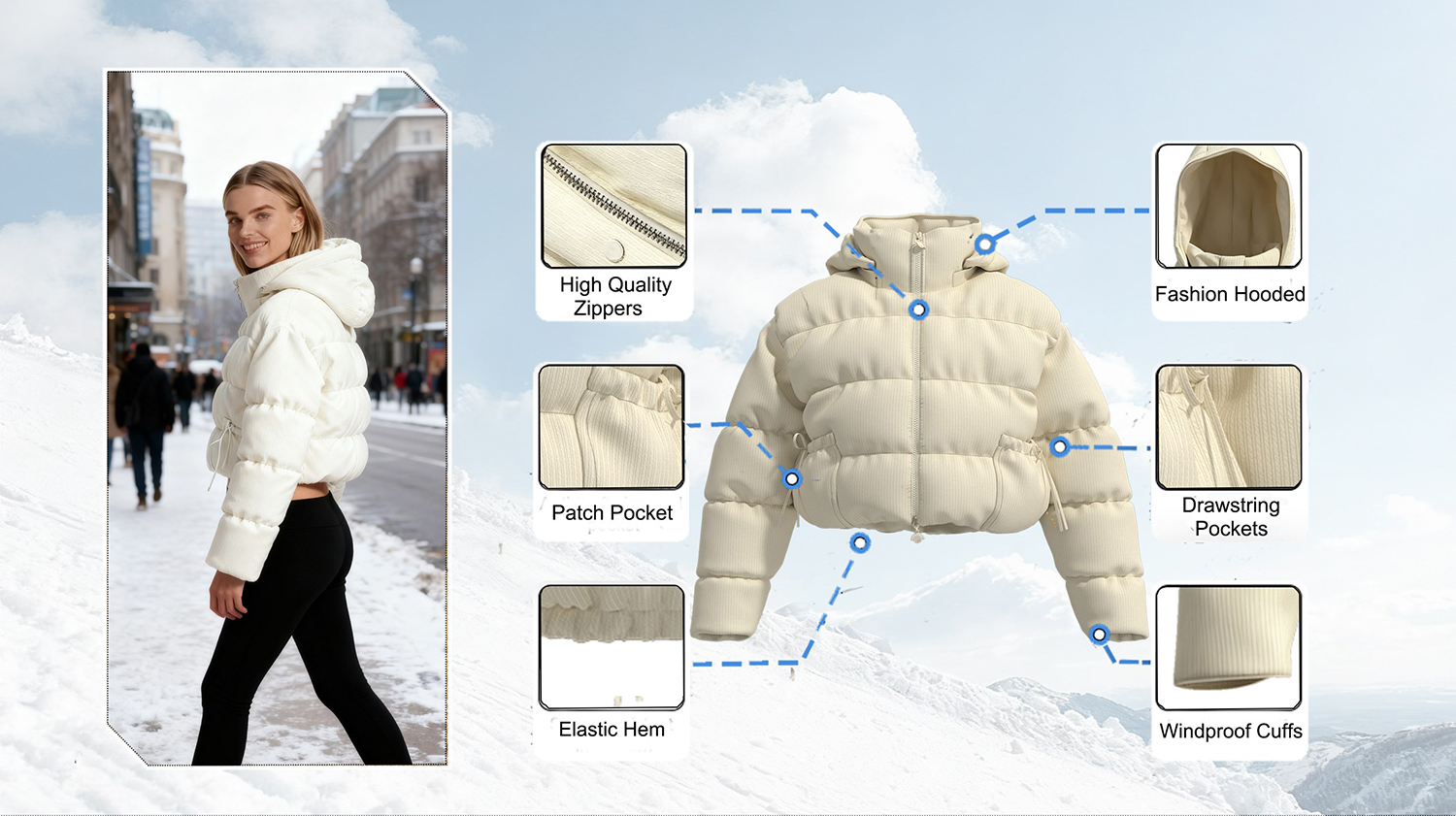 ①Textured Fabric:The textured fabric elevates the overall tactile quality and contemporary appeal, giving the down jacket a premium aesthetic in winter outfits while distinguishing it from standard down jackets with its unique character.