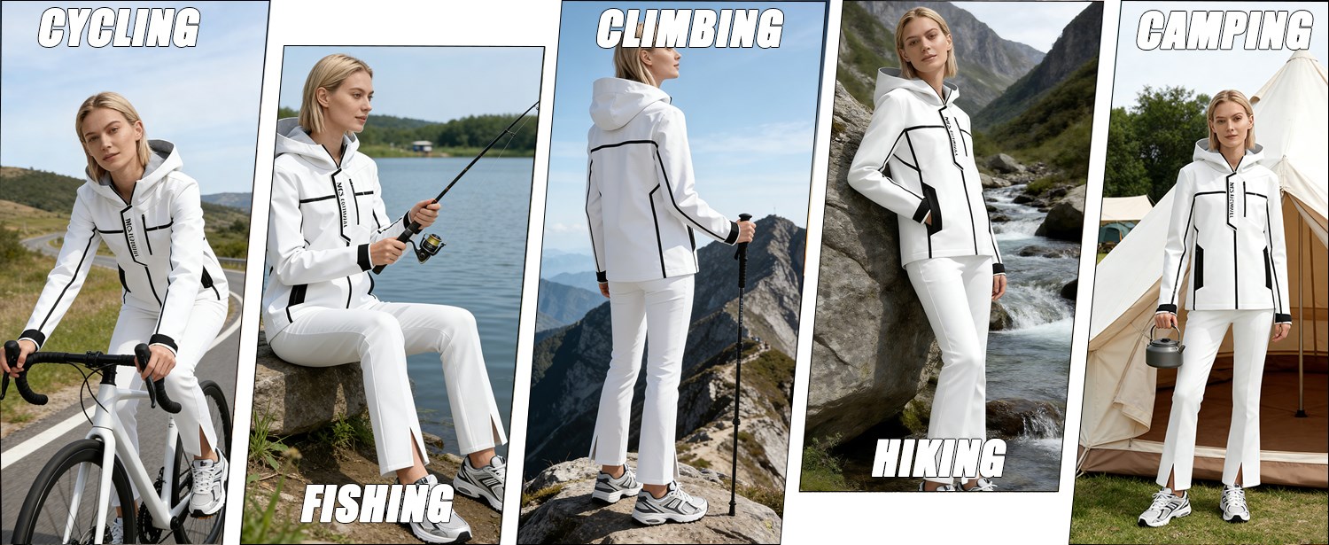 Women Windbreaker Jacket Features and Functions: 1.Fabric: KVFC-24021 22005 75D, 4 Way Elastic, Three Layers Lamination 100% Sorona Agilefabric 126G Width: 142CM process:3-in-1 2.Stylish Design: ①Fabric:Torrential Rain Defense,fully taped seams ensures total dryness in storm conditions. ②Silhouette:The design is optimized for freedom of movement, making it suitable for outdoor activities such as hiking, while also serving as a wind-resistant urban commuter jacket. This versatile garment balances practicality and style. ③Excellent Wind Resistance:The multi-pocket design increases storage capacity. ④Adjustable Fit:Hook-and-loop sleeve cuffs ensure a perfect fit, effectively blocking wind and preventing rain or snow from entering. 3:Multiple Color:Various colours available This windbreaker jacket is perfect for daily leisure wear or outdoor activities in spring, autumn, and winter. It is suitable for hiking, camping, traveling, fishing, climbing, hunting, running, etc.